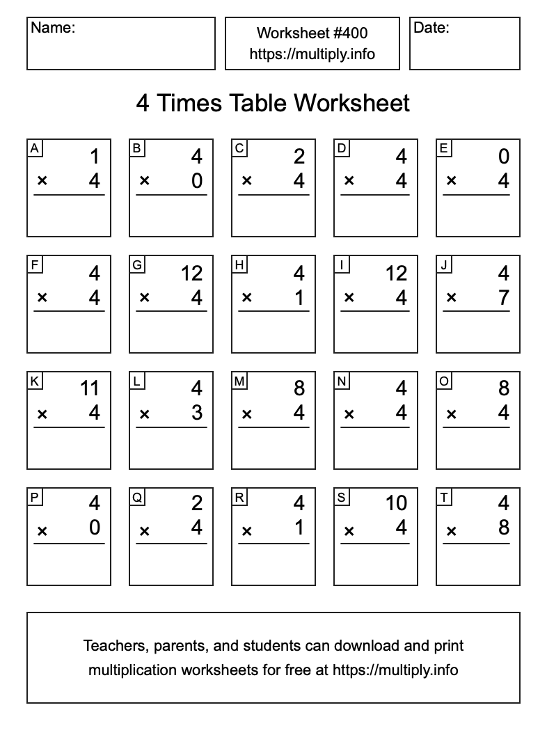 4 Times Table Worksheet #401