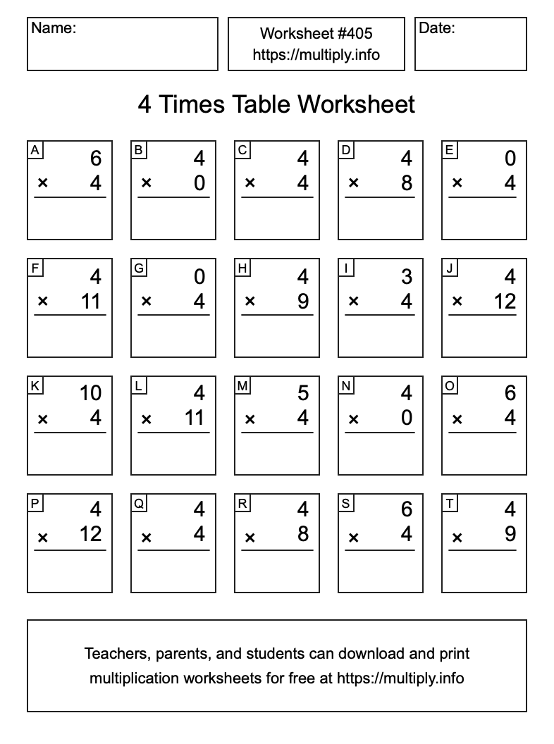 Here is the 4 Times Table Worksheet #405. This worksheet contains problems related to the multiplication table of 4. Print and/or save the worksheet using the buttons below the image. You can also drag or right-click on the image to download it to your device.