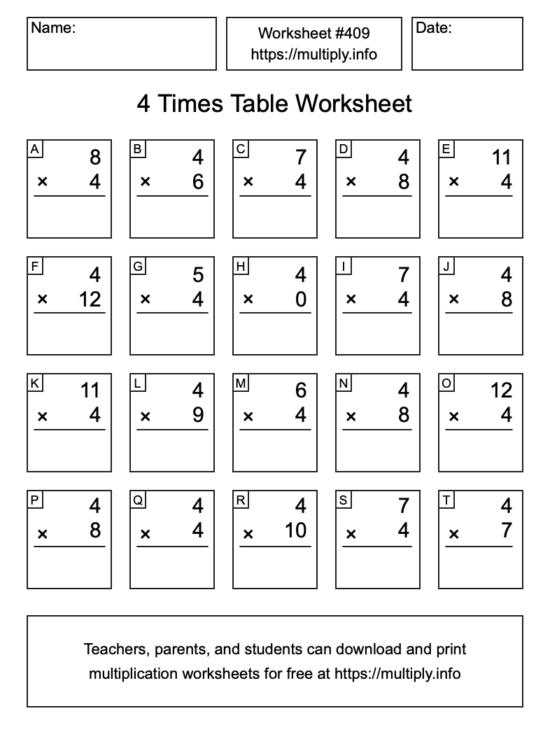 4 Times Table Worksheet #410