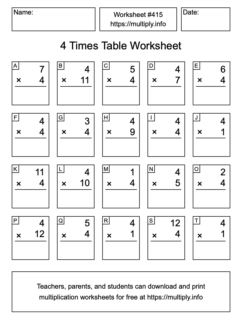 Here is the 4 Times Table Worksheet #415. This worksheet contains problems related to the multiplication table of 4. Print and/or save the worksheet using the buttons below the image. You can also drag or right-click on the image to download it to your device.