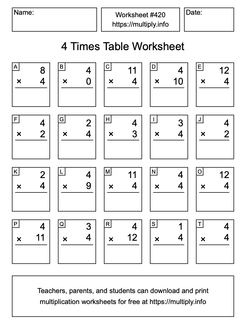 Here is the 4 Times Table Worksheet #420. This worksheet contains problems related to the multiplication table of 4. Print and/or save the worksheet using the buttons below the image. You can also drag or right-click on the image to download it to your device.