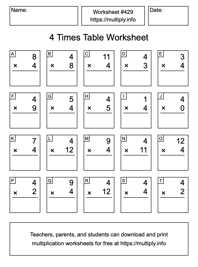 Here is the 4 Times Table Worksheet #429. This worksheet contains problems related to the multiplication table of 4. Print and/or save the worksheet using the buttons below the image. You can also drag or right-click on the image to download it to your device.