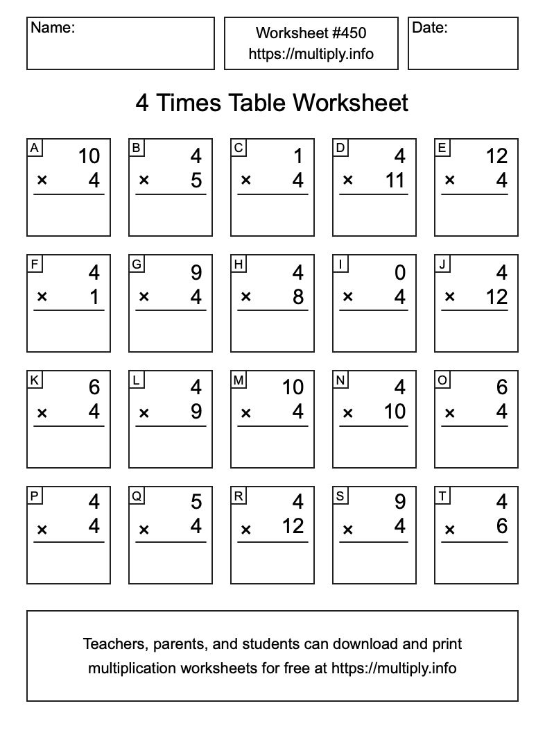 Here is the 4 Times Table Worksheet #450. This worksheet contains problems related to the multiplication table of 4. Print and/or save the worksheet using the buttons below the image. You can also drag or right-click on the image to download it to your device.
