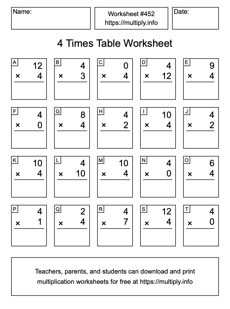 Here is the 4 Times Table Worksheet #452. This worksheet contains problems related to the multiplication table of 4. Print and/or save the worksheet using the buttons below the image. You can also drag or right-click on the image to download it to your device.