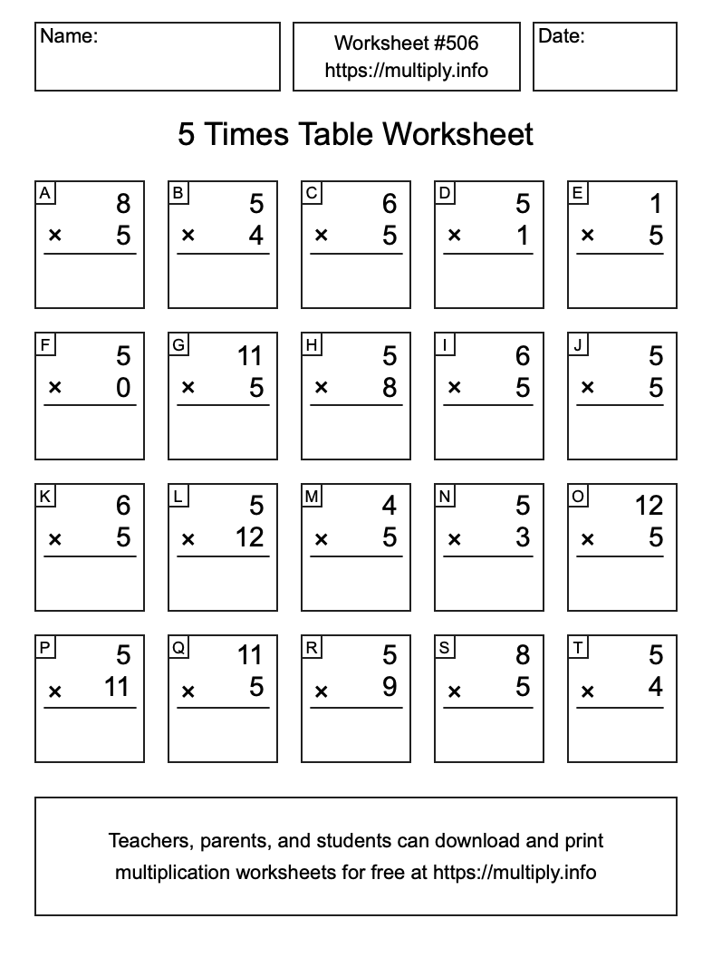 Here is the 5 Times Table Worksheet #506. This worksheet contains problems related to the multiplication table of 5. Print and/or save the worksheet using the buttons below the image. You can also drag or right-click on the image to download it to your device.