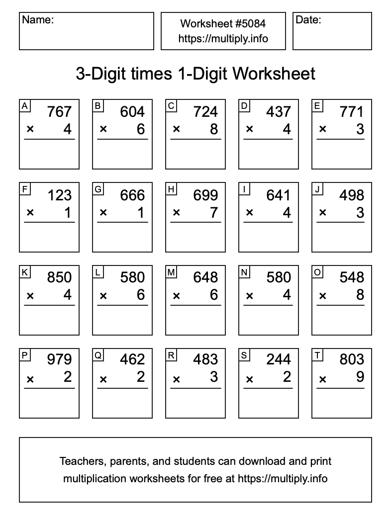 Here is the 3-Digit times 1-Digit Worksheet #5084. Use this worksheet to practice 3-Digit times 1-Digit multiplication problems. Print and/or save the worksheet using the buttons below the image. You can also drag or right-click on the image to download it to your device.