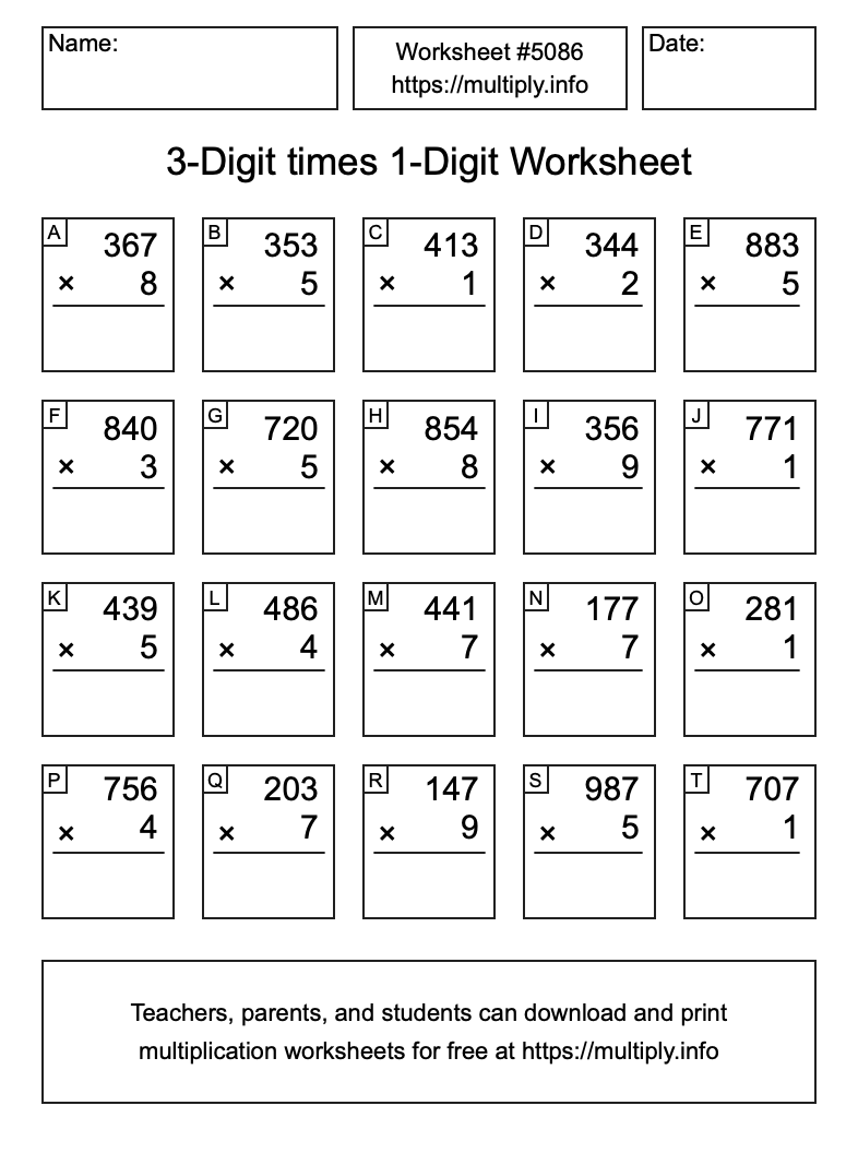 Here is the 3-Digit times 1-Digit Worksheet #5086. Use this worksheet to practice 3-Digit times 1-Digit multiplication problems. Print and/or save the worksheet using the buttons below the image. You can also drag or right-click on the image to download it to your device.