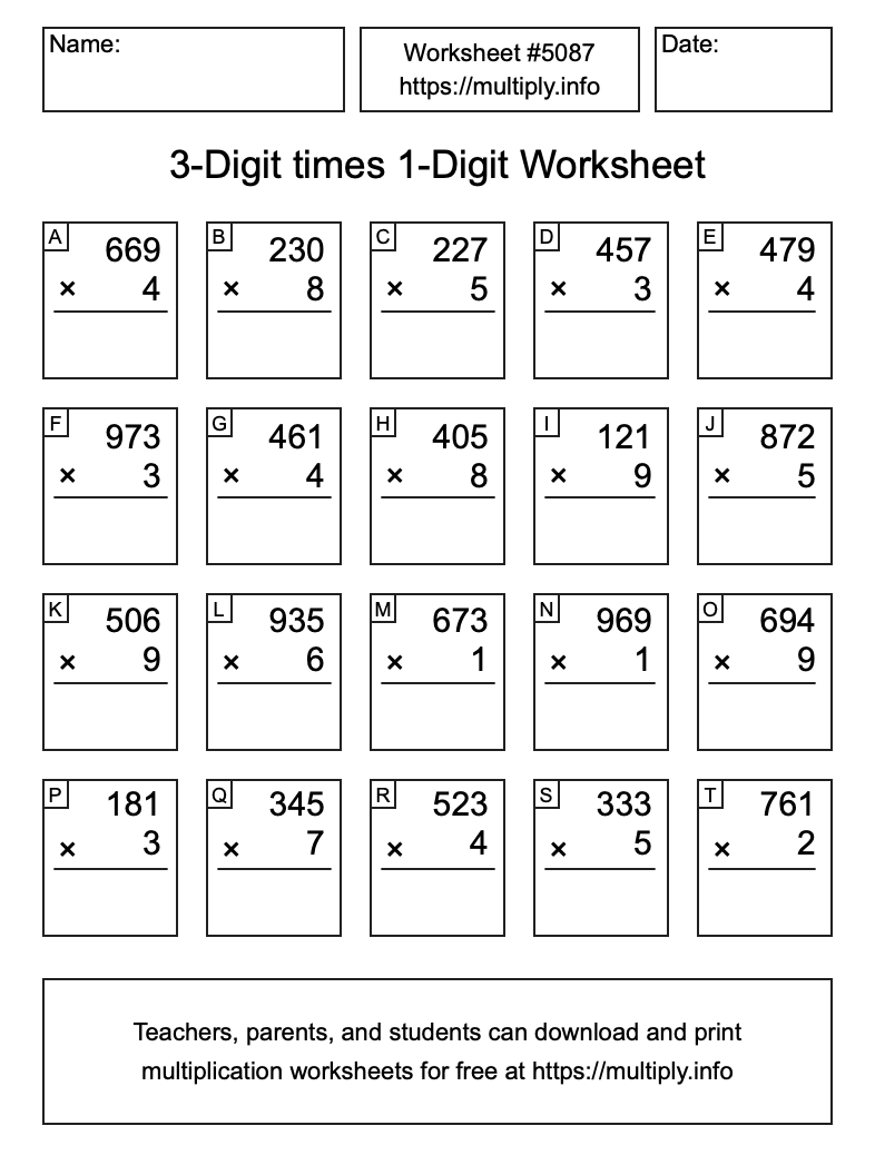 Here is the 3-Digit times 1-Digit Worksheet #5087. Use this worksheet to practice 3-Digit times 1-Digit multiplication problems. Print and/or save the worksheet using the buttons below the image. You can also drag or right-click on the image to download it to your device.