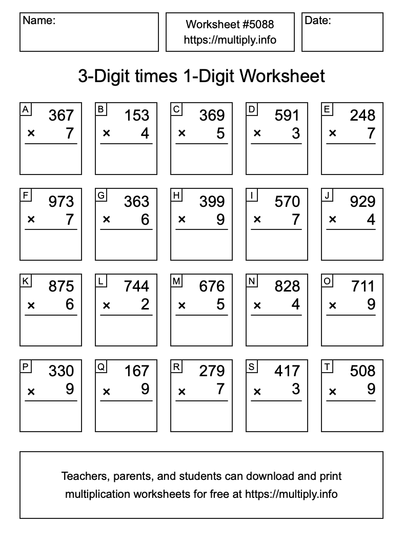 Here is the 3-Digit times 1-Digit Worksheet #5088. Use this worksheet to practice 3-Digit times 1-Digit multiplication problems. Print and/or save the worksheet using the buttons below the image. You can also drag or right-click on the image to download it to your device.