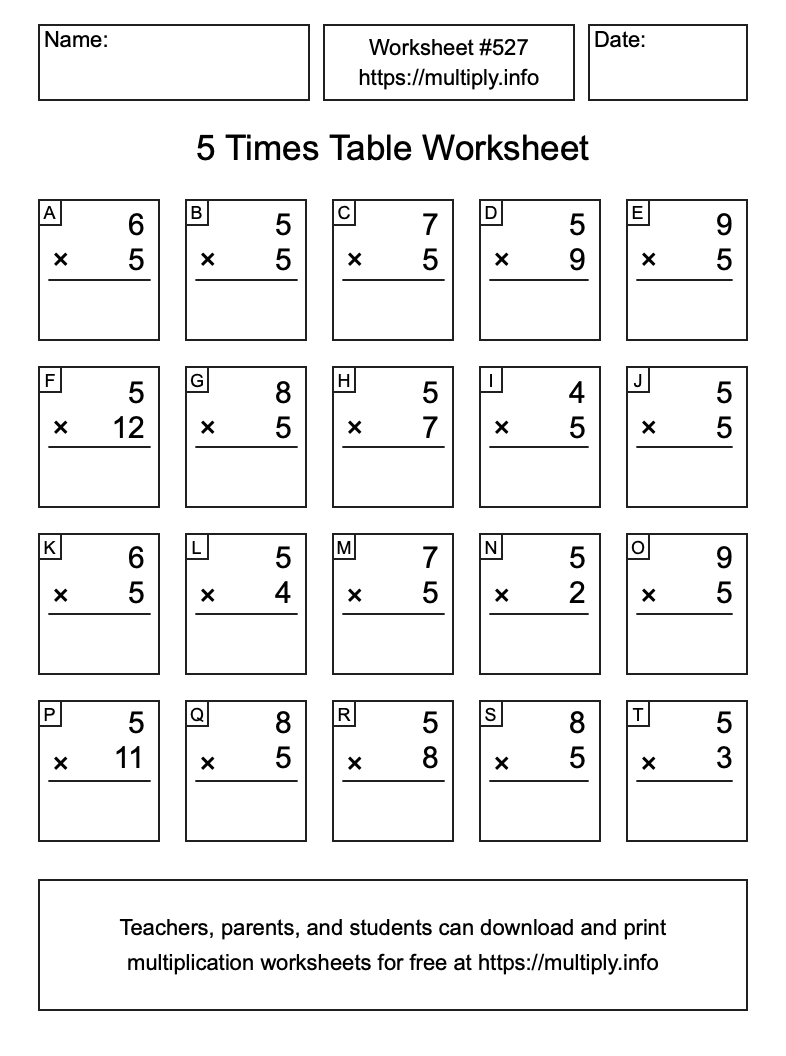 Here is the 5 Times Table Worksheet #527. This worksheet contains problems related to the multiplication table of 5. Print and/or save the worksheet using the buttons below the image. You can also drag or right-click on the image to download it to your device.
