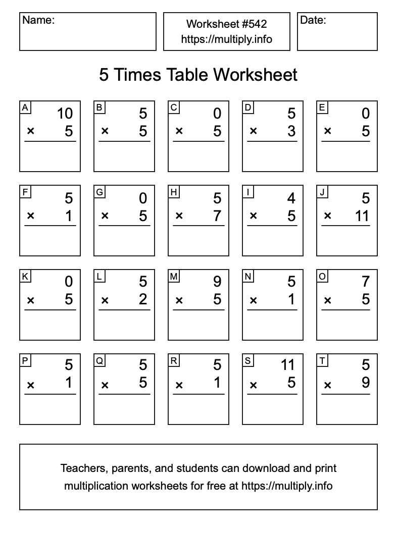 Here is the 5 Times Table Worksheet #542. This worksheet contains problems related to the multiplication table of 5. Print and/or save the worksheet using the buttons below the image. You can also drag or right-click on the image to download it to your device.