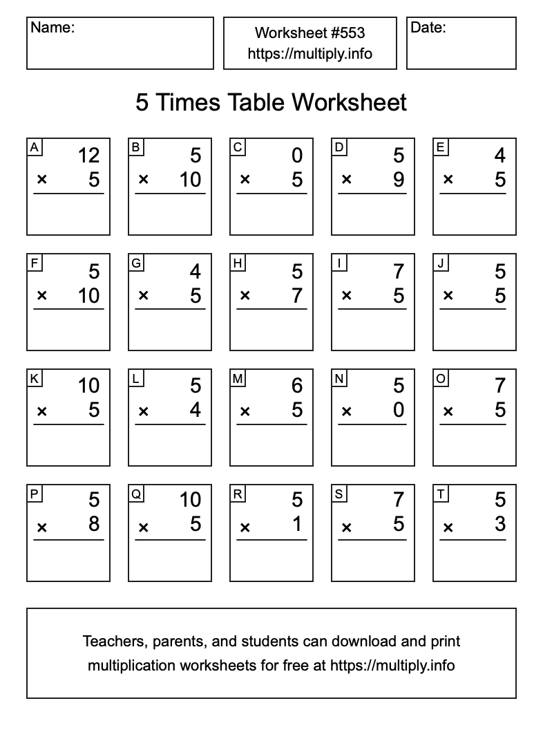 Here is the 5 Times Table Worksheet #553. This worksheet contains problems related to the multiplication table of 5. Print and/or save the worksheet using the buttons below the image. You can also drag or right-click on the image to download it to your device.