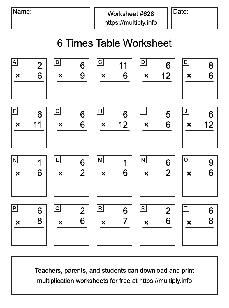 Here is the 6 Times Table Worksheet #628. This worksheet contains problems related to the multiplication table of 6. Print and/or save the worksheet using the buttons below the image. You can also drag or right-click on the image to download it to your device.