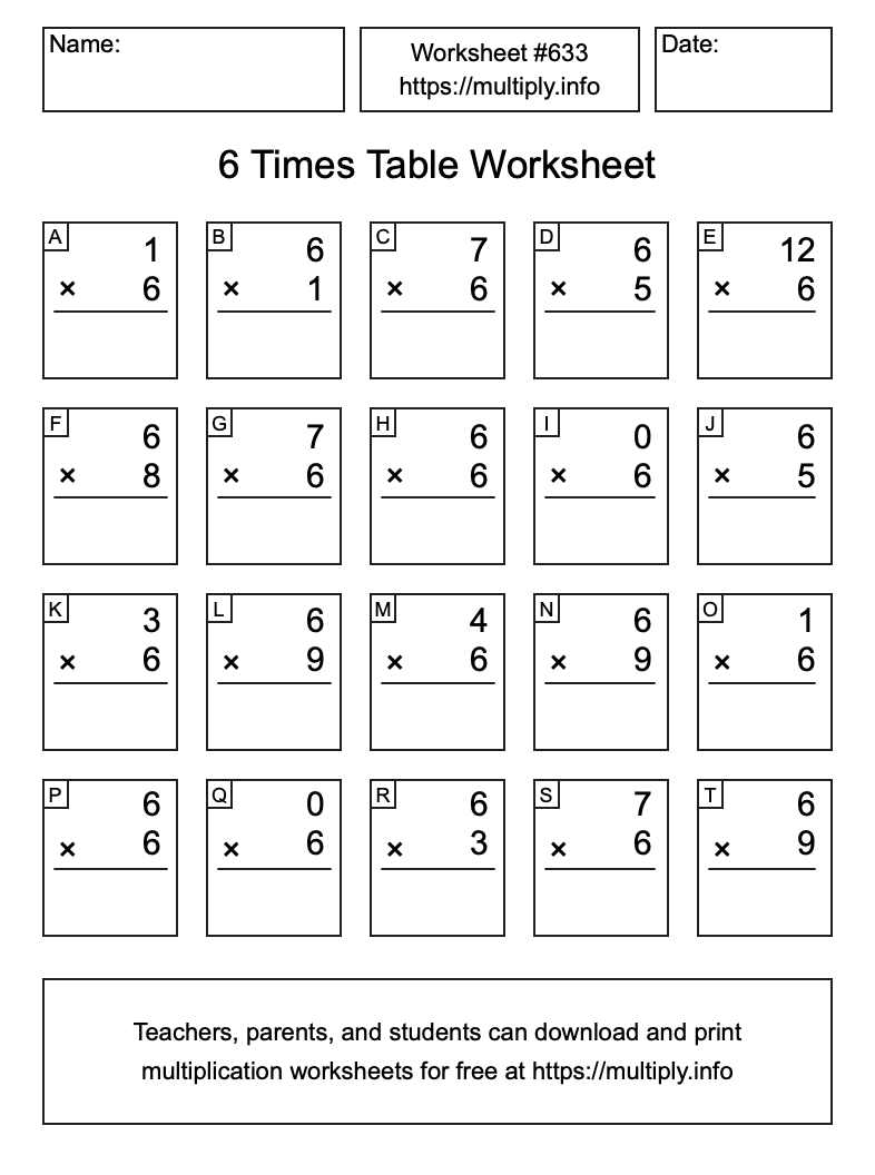 Here is the 6 Times Table Worksheet #633. This worksheet contains problems related to the multiplication table of 6. Print and/or save the worksheet using the buttons below the image. You can also drag or right-click on the image to download it to your device.