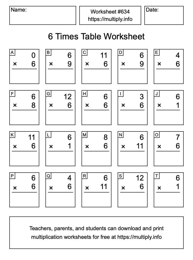 Here is the 6 Times Table Worksheet #634. This worksheet contains problems related to the multiplication table of 6. Print and/or save the worksheet using the buttons below the image. You can also drag or right-click on the image to download it to your device.