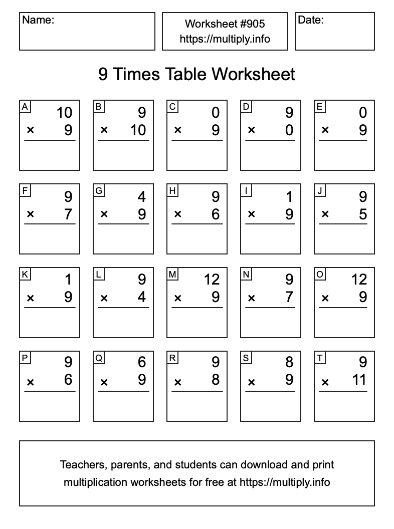 Here is the 9 Times Table Worksheet #905. This worksheet contains problems related to the multiplication table of 9. Print and/or save the worksheet using the buttons below the image. You can also drag or right-click on the image to download it to your device.