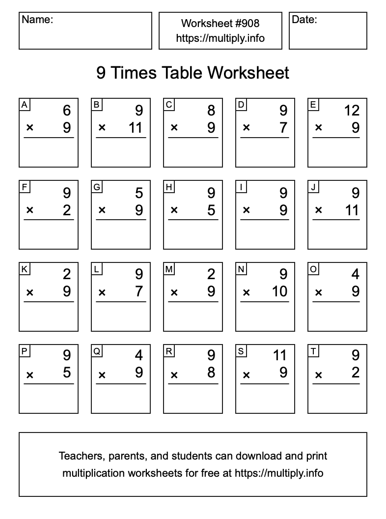 Here is the 9 Times Table Worksheet #908. This worksheet contains problems related to the multiplication table of 9. Print and/or save the worksheet using the buttons below the image. You can also drag or right-click on the image to download it to your device.