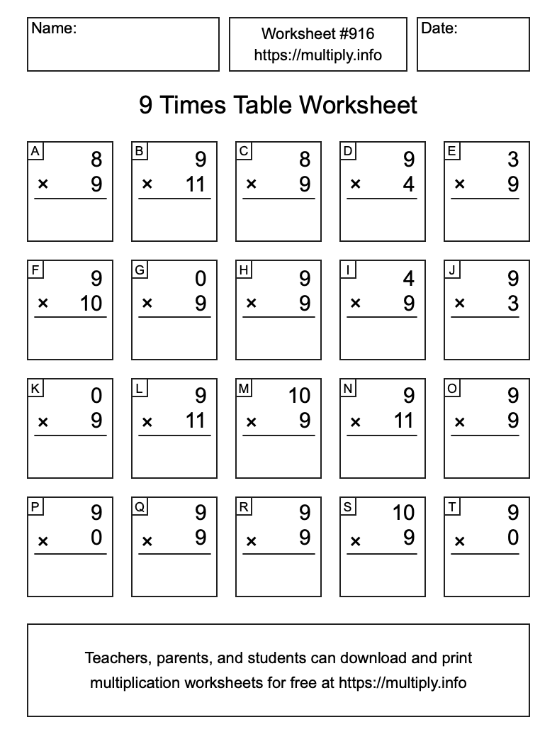 Here is the 9 Times Table Worksheet #916. This worksheet contains problems related to the multiplication table of 9. Print and/or save the worksheet using the buttons below the image. You can also drag or right-click on the image to download it to your device.