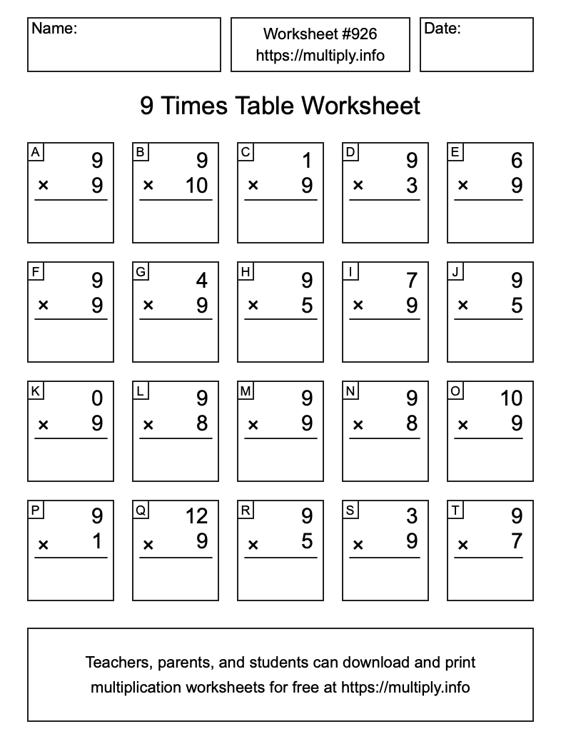 9 Times Table Worksheet #927
