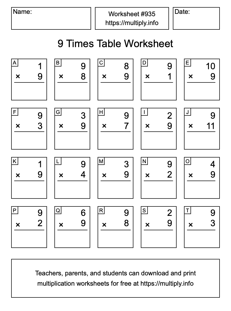 Here is the 9 Times Table Worksheet #935. This worksheet contains problems related to the multiplication table of 9. Print and/or save the worksheet using the buttons below the image. You can also drag or right-click on the image to download it to your device.