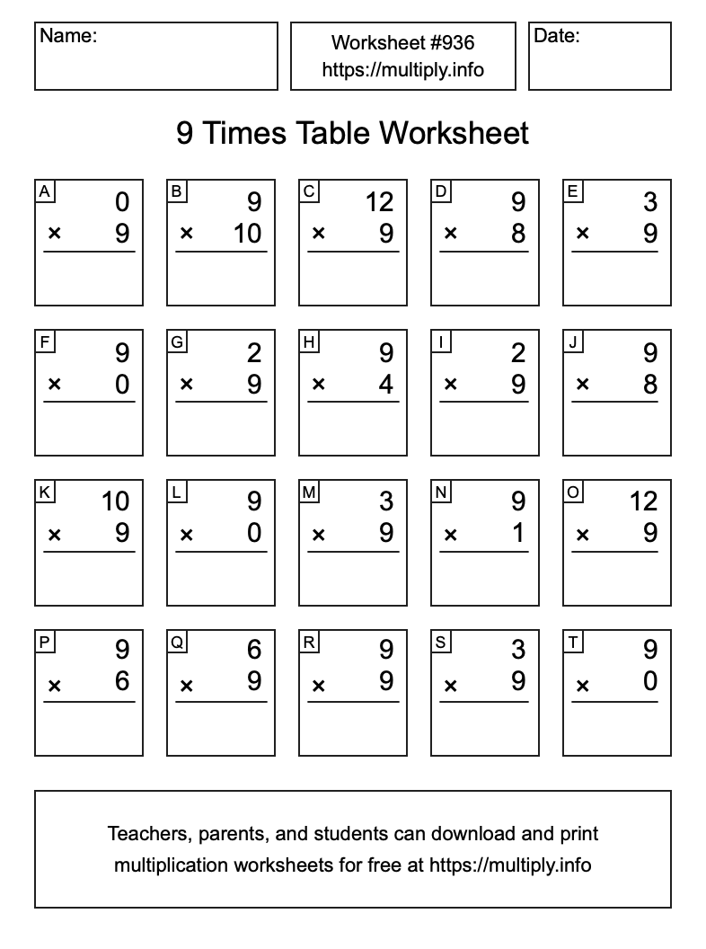 Here is the 9 Times Table Worksheet #936. This worksheet contains problems related to the multiplication table of 9. Print and/or save the worksheet using the buttons below the image. You can also drag or right-click on the image to download it to your device.