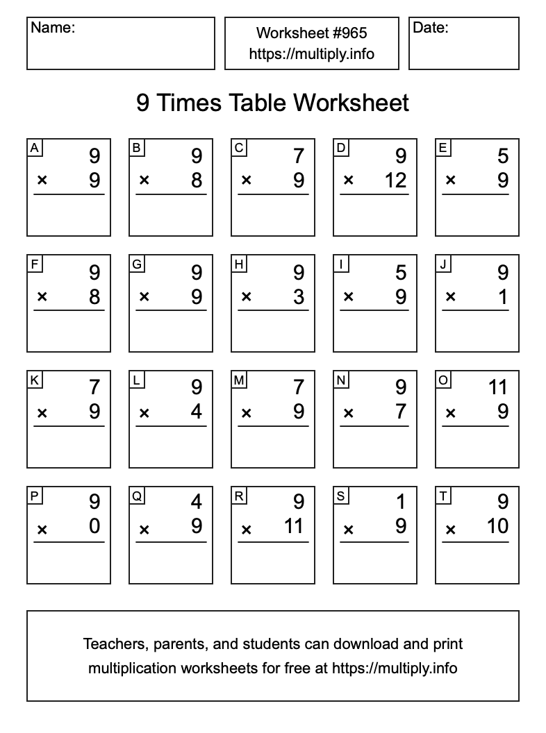 Here is the 9 Times Table Worksheet #965. This worksheet contains problems related to the multiplication table of 9. Print and/or save the worksheet using the buttons below the image. You can also drag or right-click on the image to download it to your device.