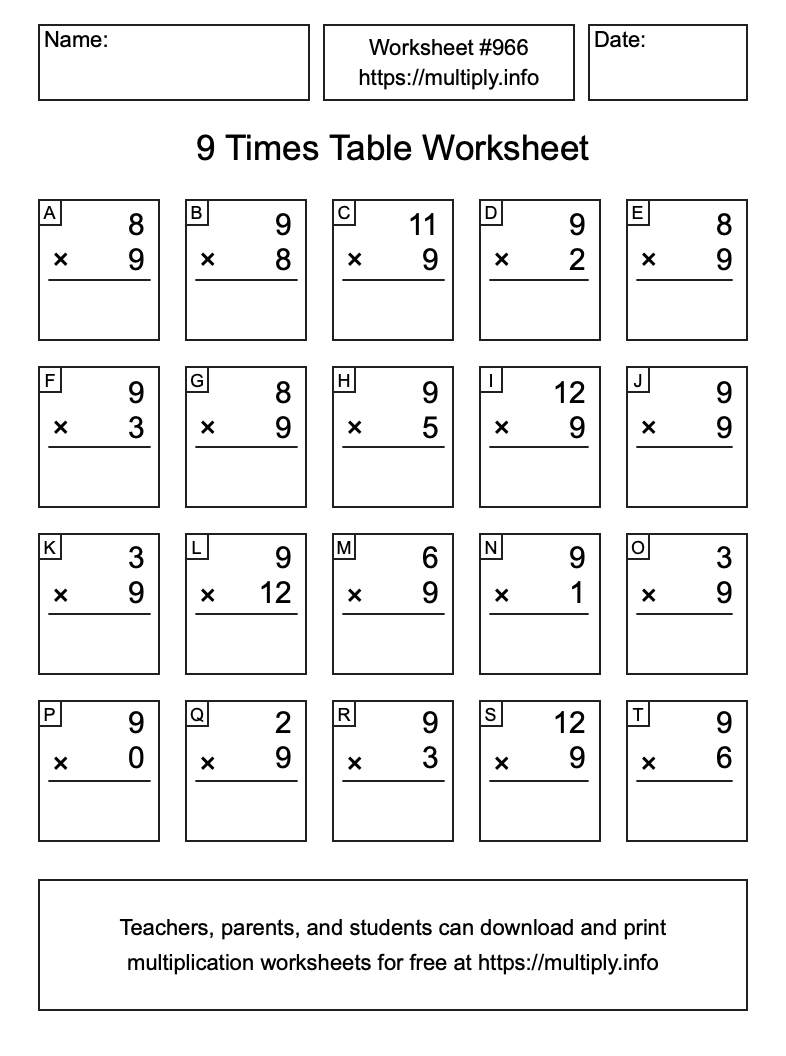 Here is the 9 Times Table Worksheet #966. This worksheet contains problems related to the multiplication table of 9. Print and/or save the worksheet using the buttons below the image. You can also drag or right-click on the image to download it to your device.