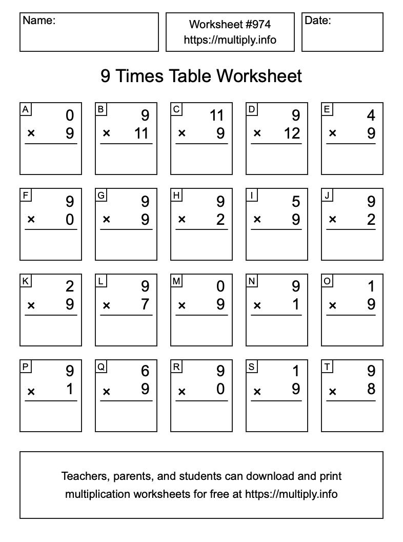 Here is the 9 Times Table Worksheet #974. This worksheet contains problems related to the multiplication table of 9. Print and/or save the worksheet using the buttons below the image. You can also drag or right-click on the image to download it to your device.