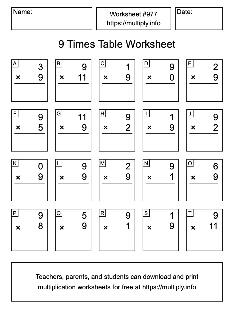 9 Times Table Worksheet #978