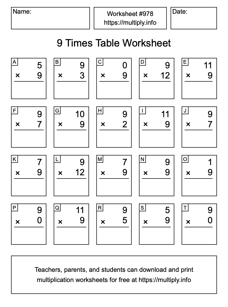 Here is the 9 Times Table Worksheet #978. This worksheet contains problems related to the multiplication table of 9. Print and/or save the worksheet using the buttons below the image. You can also drag or right-click on the image to download it to your device.