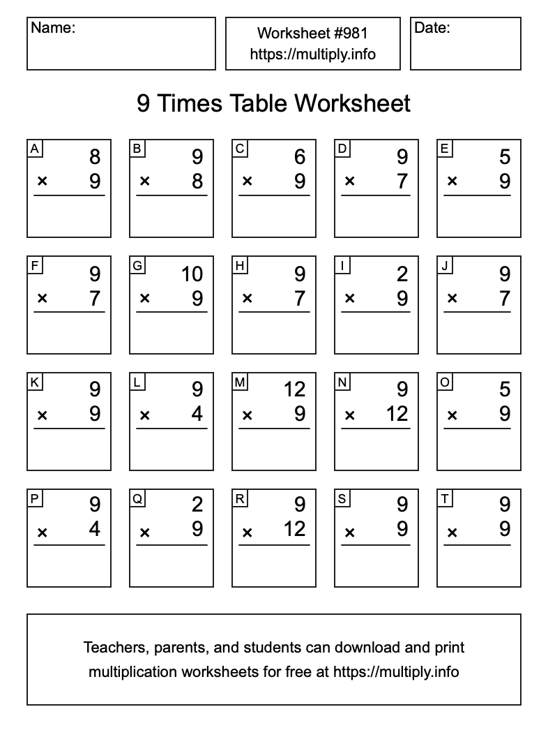 Here is the 9 Times Table Worksheet #981. This worksheet contains problems related to the multiplication table of 9. Print and/or save the worksheet using the buttons below the image. You can also drag or right-click on the image to download it to your device.