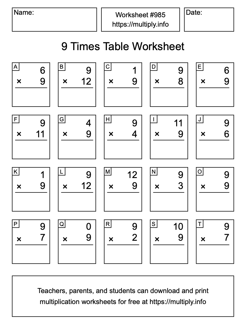 Here is the 9 Times Table Worksheet #985. This worksheet contains problems related to the multiplication table of 9. Print and/or save the worksheet using the buttons below the image. You can also drag or right-click on the image to download it to your device.