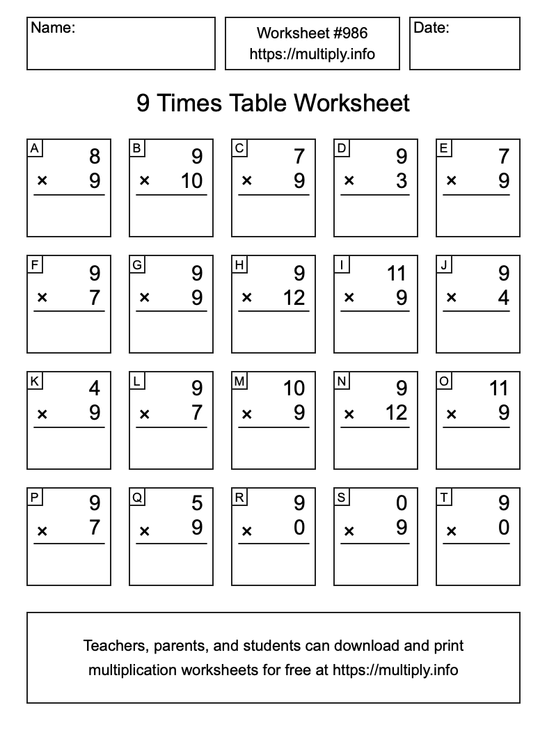 Here is the 9 Times Table Worksheet #986. This worksheet contains problems related to the multiplication table of 9. Print and/or save the worksheet using the buttons below the image. You can also drag or right-click on the image to download it to your device.
