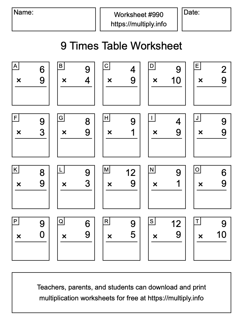 9 Times Table Worksheet #991