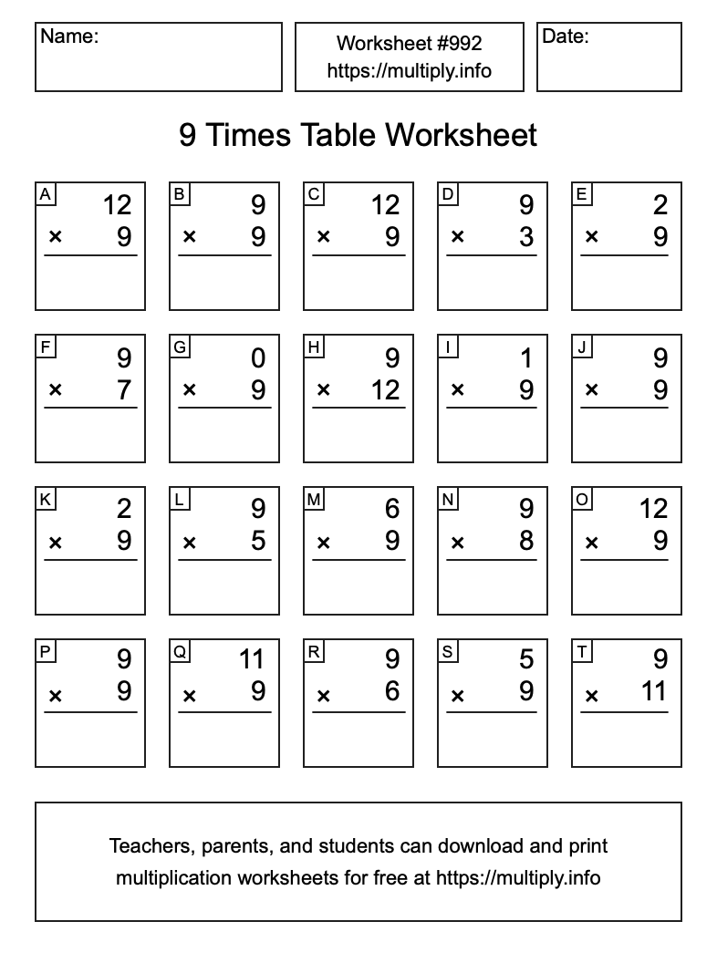Here is the 9 Times Table Worksheet #992. This worksheet contains problems related to the multiplication table of 9. Print and/or save the worksheet using the buttons below the image. You can also drag or right-click on the image to download it to your device.