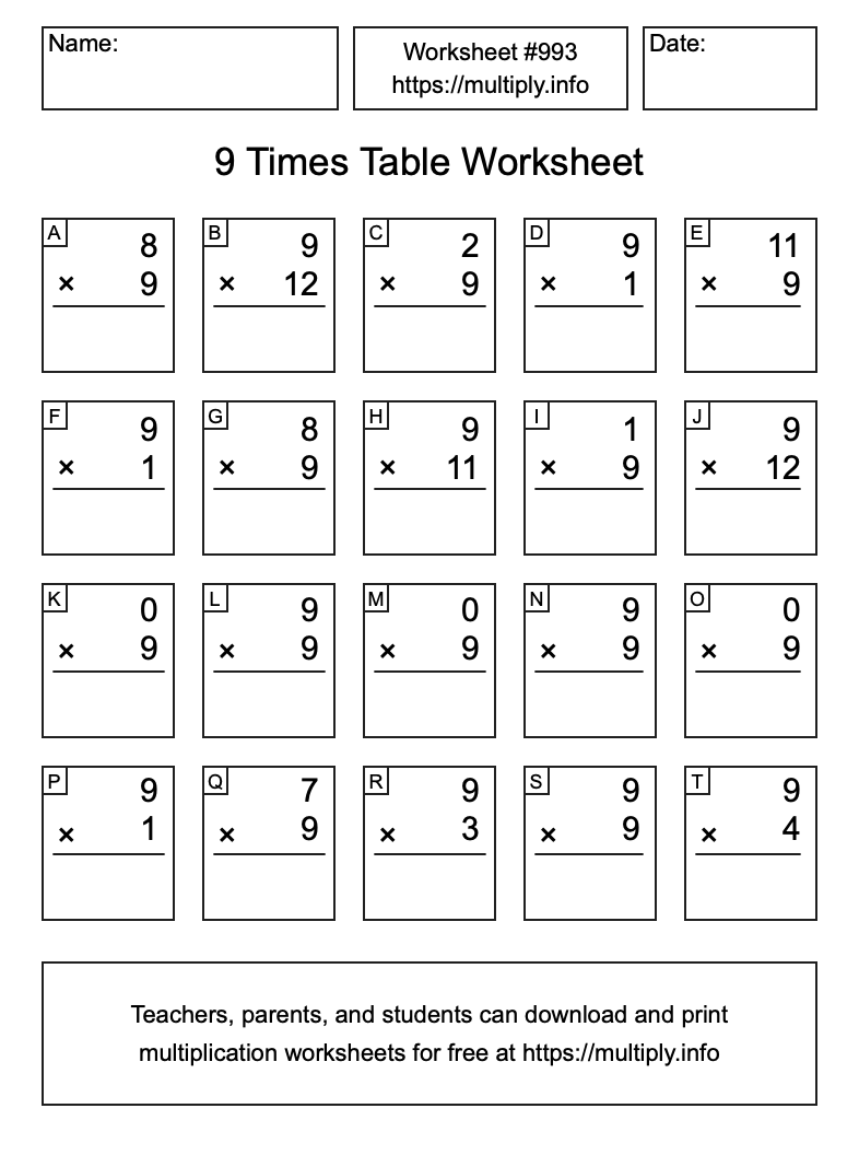 Here is the 9 Times Table Worksheet #993. This worksheet contains problems related to the multiplication table of 9. Print and/or save the worksheet using the buttons below the image. You can also drag or right-click on the image to download it to your device.