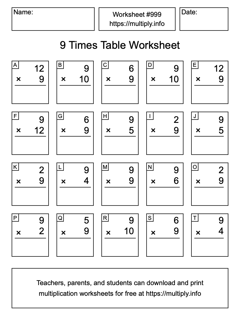 Here is the 9 Times Table Worksheet #999. This worksheet contains problems related to the multiplication table of 9. Print and/or save the worksheet using the buttons below the image. You can also drag or right-click on the image to download it to your device.